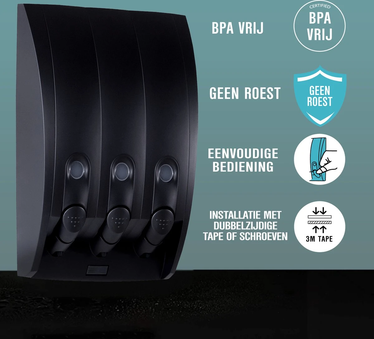 Zoek je een mooie en degelijke zeepdispenser voor in je badkamer? Deze zeepdispenser is gemaakt van kunststof en heeft een moderne mat zwarte look. De mat zwarte kleur zorgt voor een moderne en stijlvolle look en past in iedere badkamer. De reservoirs hebben een kijkvenster zodat je kunt zien hoeveel er nog in zit. Losse flesjes en flacons zijn verleden tijd. Alles overzichtelijk bij elkaar en zonder hinderlijke druppels door het uniek gepatenteerde anti-lek systeem. De kunststof uitvoering zorgt er voor dat er geen roest op kan treden.